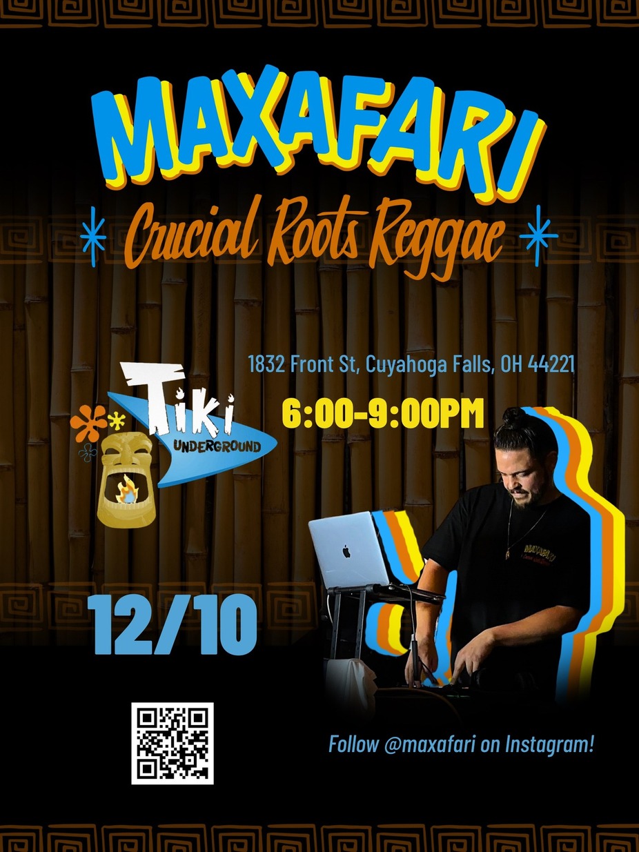 DJ Maxafari is back 12/10 to bring the island vibes with reggae music from 6-9pm (inside). A perfect pairing with our delicious cocktails. It always feels like Summer at Tiki Underground! Escape with us! No cover, 21 +